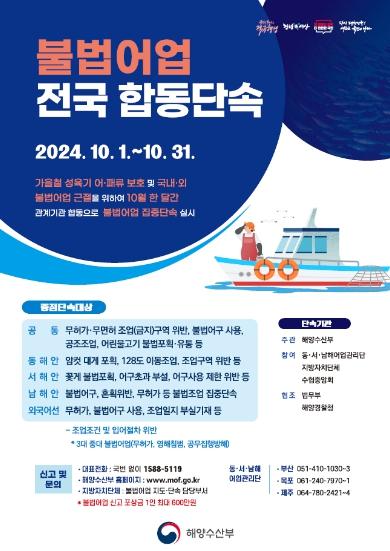 해양수산부는 가을철 성어기를 맞아 10월 한 달간 해양경찰청, 11개 지방자치단체, 수협중앙회 등 관계기관과 함께 고질적 불법어업 행위를 집중적으로 단속한다.