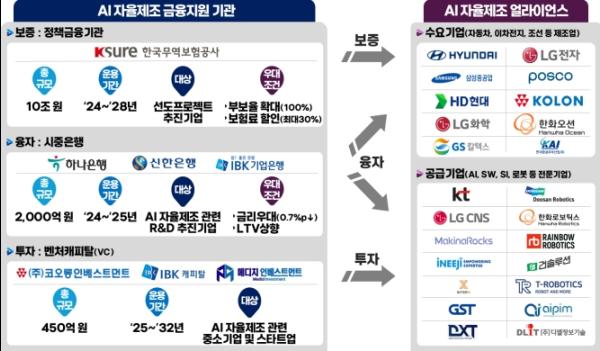 신한, 기업, 하나 등 3개 시중은행은 AI 자율제조 기술을 보유한 기업들을 위해 0.7%p 우대금리를 적용한 2,000억원 규모의 대출 프로그램을 지원한다. 이 프로그램은 AI 자율제조 관련 연구개발(R·D)을 추진하거나 AI 자율제조를 생산현장에 적용하는 기업들에 제공될 예정으로 산업통상자원부가 지원대상 기업들을 추천하게 된다.