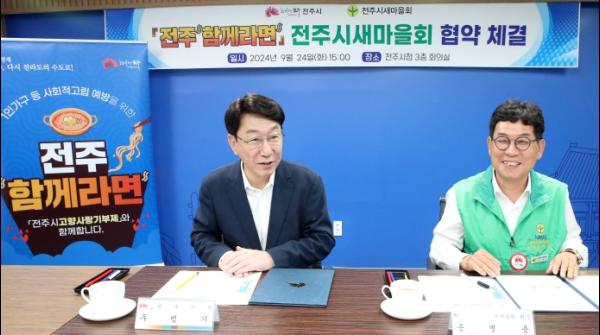 전주시와 전주시새마을회는 24일 시청 3층 회의실에서 우범기 전주시장, 송병용 전주시 새마을회 회장과 박창석 새마을지도자 전주시협의회장, 유선영 전주시새마을부녀회장, 한복순 새마을문고 전주시지부 회장 등 전주지역 새마을회 임원들이 참석한 가운데 ‘전주 함께라면 위기가구 발굴과 기부와 나눔문화 활성화를 위한 업무협약’을 체결했다.