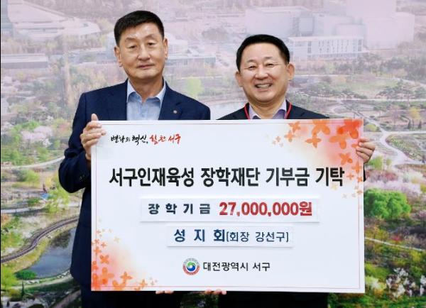 대전 서구 인재육성장학재단은 25일 성지회로부터 장학기금 2천7백만 원을 기탁받았다.