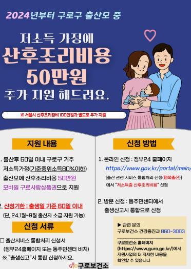 구로구가 사각지대에 놓인 저소득층 출산가정의 경제적 부담을 덜어주기 위해 오는 10월부터 산모 1인당 50만 원씩 산후조리비용을 추가로 지원한다.