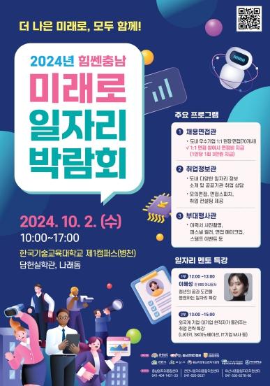 도는 오는 2일 천안 한국기술교육대 제1캠퍼스에서 우수기업 면접 및 취업지원 서비스 등을 제공하는 ‘2024 힘쎈충남 미래로 일자리박람회’를 개최한다고 27일 밝혔다.