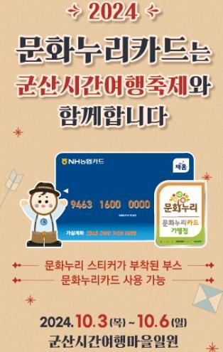 군산시가 오는 10월 3일부터 6일까지 열리는 2024 시간여행축제에서 통합문화이용권(문화누리카드) 임시가맹점을 운영한다.