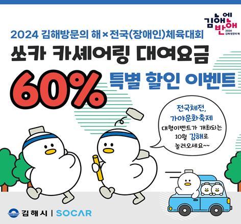 김해시는 전국(장애인)체전, 가야문화축제와 같은 대형이벤트가 개최되는 10월 한 달간 모빌리티 플랫폼인 쏘카 차량을 이용해 김해를 찾는 모든 방문객들에게 카셰어링 대여요금 60% 특별 할인 이벤트를 진행한다고 27일 밝혔다.