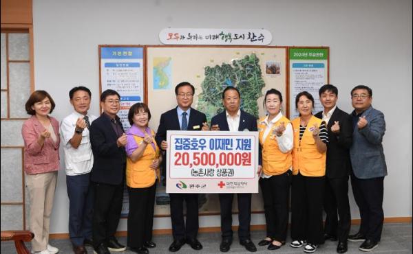 대한적십자사 전북특별자치도지사가 지난 26일 완주군 집중호우 피해 이재민에게 2,050만 원 상당의 농협 농촌사랑상품권을 전달했다.