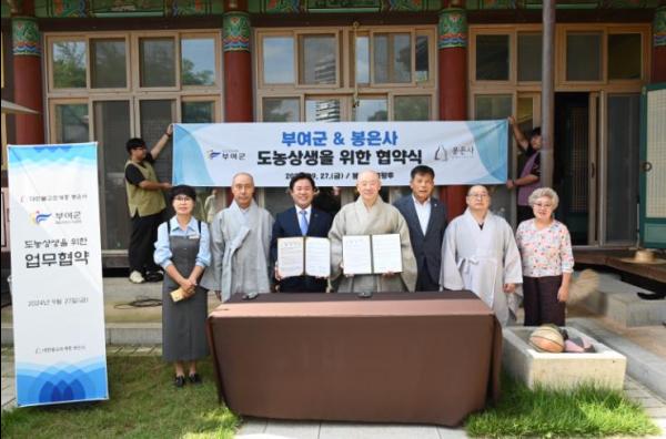 부여군은 27일 서울 강남 한가운데 자리하고 있는 봉은사 법왕루에서 굿뜨래 농특산물 직거래 확대를 위한 도농 상생 업무협약을 체결했다고 밝혔다.