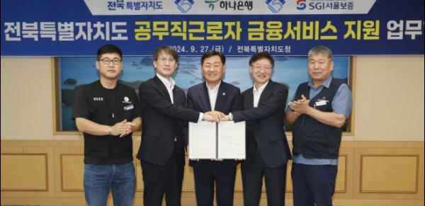전북특별자치도는 27일 하나은행 및 서울보증보험과 전북특별자치도 공무직근로자 금융서비스 지원을 위한 업무협약을 체결했다고 밝혔다.