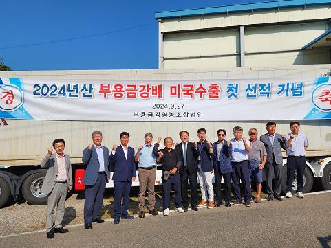 세종특별자치시 부용금강영농조합법인은 27일 부강면 수출선과장에서 세종 배(품종:신고) 28.5t을 미국 수출을 위해 선적했다.