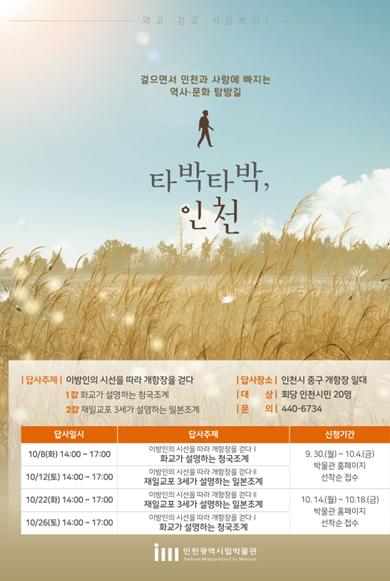 인천광역시 시립박물관은 오는 10월 8일부터 25일까지 총 4회에 걸쳐 '타박타박, 인천-이방인의 시선을 따라 개항장을 걷다' 도보답사 프로그램을 운영한다고 밝혔다.