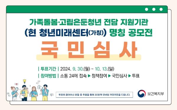 보건복지부는 8월 27일부터 9월 10일까지 실시한 ' (가칭) 청년미래센터 정식 명칭 공모'결과 제출된 공모작 중 8점에 대해 대국민 온라인 투표를 실시한다고 밝혔다.