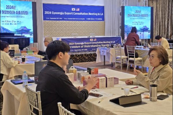 시에 따르면 지난달 25일 미국 LA 한인타운 가든스위트호텔에서 열린 ‘2024 경주시 해외바이어 수출상담회’에 경주지역 식품제조기업 10곳이 참가해 LA지역 30곳의 바이어와 수출 상담을 진행했다.