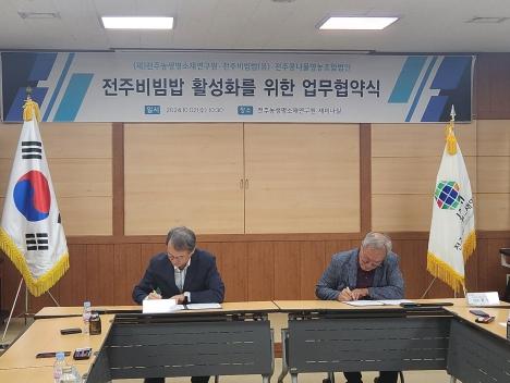 (재)전주농생명소재연구원은 2일 농생명소재연구원 1층 세미나실에서 농업회사법인 전주비빔밥(유), 전주콩나물영농조합법인과 ‘전주비빔밥 활성화를 위한 업무협약’을 체결했다.