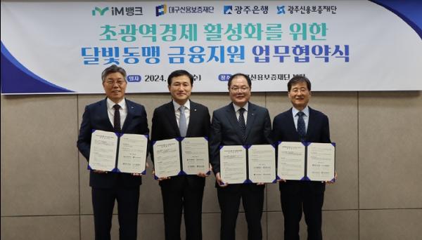 대구신용보증재단은 10월 2일 재단 본점에서 iM뱅크, 광주신용보증재단, 광주은행과 ‘초광역경제 활성화를 위한 달빛동맹 금융지원 업무협약’을 체결했다.