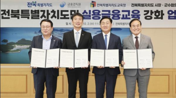 전북특별자치도는 2일 전북자치도청에서 금융감독원, 전북특별자치도교육청, 전북특별자치도 시장군수협의회와 전북도민의 금융역량 강화를 위해 상호협력 업무협약을 체결했다.