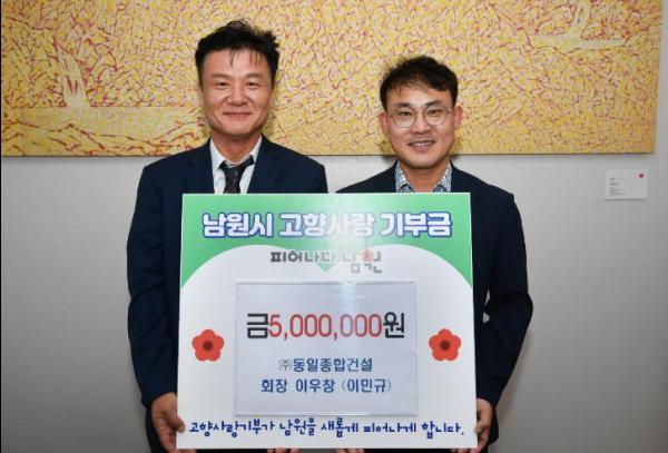 ㈜동일종합건설 이우창 회장과 이민규 대표는 지난 9월 30일, 고향인 남원시를 찾아 고향사랑기부금 500만원을 기탁했다.