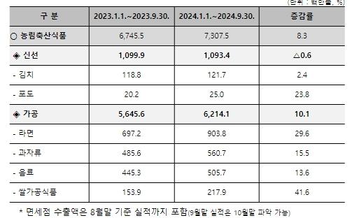 농림축산식품부는 2024년 9월말 기준 농식품(K-Food) 수출 누적액(잠정)이 지난해보다 8.3% 증가한 73억 750만불을 기록했다고 밝혔다. 작년보다 이른 추석연휴로 인해 조업일수가 전년동기대비 적었음에도, 농식품 수출은 역대 9월말 실적 중 최대 실적을 달성했고 13개월 연속 전년 동기 대비 성장세를 보였다.