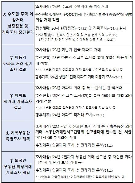 수도권 주택 이상거래에 대한 관계기관 합동 현장점검은 최근 가격 상승세가 이어지고 있는 1기 신도시 등을 포함한 수도권 전 지역으로 확대하여 연말까지 실시하고, 금년도 거래 신고분에 대한 기획조사는 ’25년 4월까지 지속 추진한다.