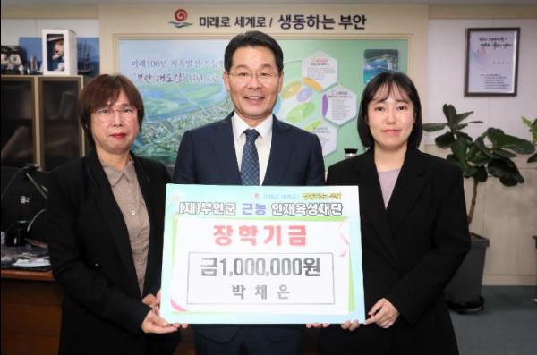 상서면 박채은씨 가족은 지난 2일 부안군 근농인재육성재단을 방문하여 지역인재육성을 위한 장학금 100만원을 기탁했다.