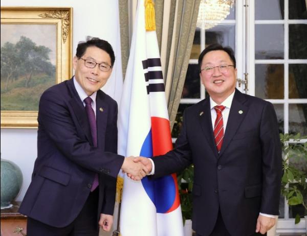 이장우 대전시장과 지역 경제사절단이 3일(현지시각) 스웨덴 대사 관저를 방문한 가운데, 이형종 대사가 북유럽에 진출하고자 하는 바이오기업 등의 교두보 역할을 약속했다.