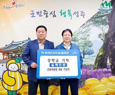 코리아관광은 성주읍에 위치한 국내외 여행업체로 성주군 인재양성에 도움이 되고자 장학금 1백만원을 기탁하게 되었다고 밝혔다.