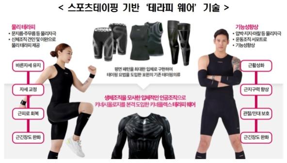㈜포윈은 스포츠 테이핑과 키네시올로지 테이핑 논리를 적용하여 신체 기능 개선과 보호, 통증 완화, 자세 교정 등을 목적으로 하는 ‘테라피 웨어’를 새롭게 개발해 물리치료학 논리를 의류에 접목한 혁신적인 기술을 선보여 높은 평가를 받았다.