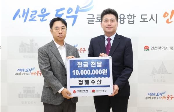 연안부두 청해수산은 지난 7일 인천 중구청을 방문해 “관내 취약계층 복지사업을 위해 사용해 달라”며 현금 1,000만 원을 기탁했다.
