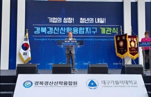 이날 개관식에는 이재석 산업통상자원부 입지총괄과장, 이정우 경상북도 메타AI과학국장, 조현일 경산시장, 성한기 대구가톨릭대학교 총장, 김봉환 (사)경북경산산학융합원장 등 300여 명이 참석했다.