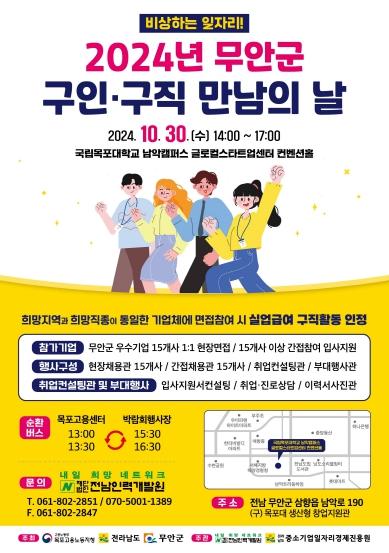 전남 무안군은 오는 10월 30일 목포대학교 남악캠퍼스 글로컬스타트업센터 내 컨벤션 홀에서 개최되는 ‘2024년 무안군 구인·구직 만남의 날’ 행사에 참여할 구직자를 모집한다.