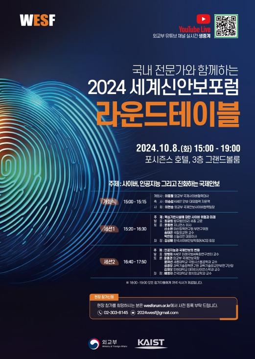 외교부는 2024 '세계신안보포럼(World Emerging Security Forum, WESF)'개최(12.5.(목))를 준비하고, 신흥안보 위협 대응을 위한 정부·학계 간 논의를 촉진·심화하기 위해 10월8일 한국과학기술원(KAIST)과 공동으로 라운드테이블을 개최했다.