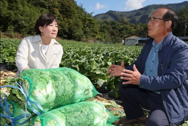 송미령 농림축산식품부 장관은 10월 9일 충북 단양군 일원의 배추 밭을 찾아 10월 중순과 하순에 출하될 배추 생육 상황과 출하 동향을 점검했고, 휴일에도 배추 생산과 출하에 애쓰고 있는 농업인과 현장 관계자들을 격려했다.