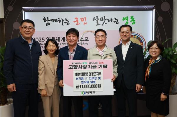충북 영동군은 남기용 농협양곡 감사실장(NH농협은행 영동군지부 前 지부장) 및 NH농협은행 영동군지부 등 임직원들이 고향사랑기부금으로 1,100만원을 기탁했다고 10일 밝혔다.