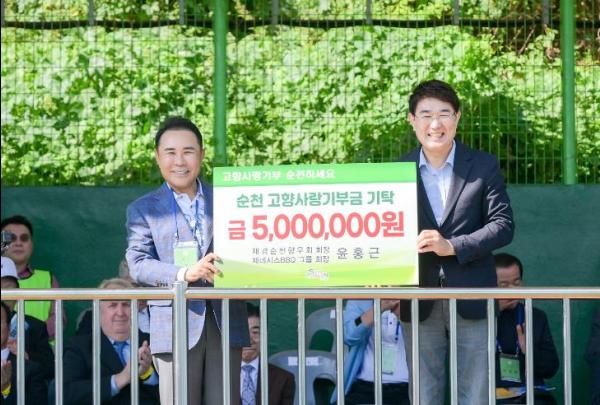 순천시는 지난 9일 서울 관악구민운동장에서 열린 (사)재경순천애향회 행사에서 재경순천향우회 윤홍근 회장(제너시스BBQ 회장)과 고향사랑기부금 500만원 기탁식을 가졌다.