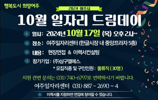 여주시는 10월 17일 여주일자리센터에서 2024년 10월 '일자리드림데이'를 실시한다고 밝혔다.