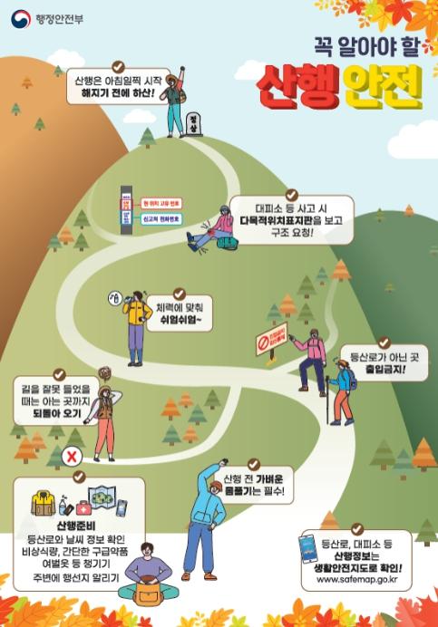 행정안전부는 설악산에서 시작된 단풍이 전국으로 확대되면서 단풍을 즐기려는 등산객이 많아짐에 따라, 산행 시 안전사고 발생에 각별한 주의를 요청했다.