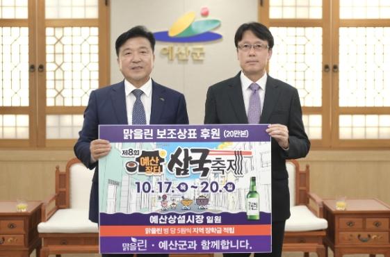 예산군과 ㈜선양소주는 군청 상황실에서 최재구 예산군수와 강재규 ㈜선양소주 영업본부장 등이 참석한 가운데 군 대표 축제인 ‘제8회 예산장터 삼국축제’의 홍보를 위한 ‘맑을 린’ 소주 홍보라벨 전달식을 진행했다고 11일 밝혔다.