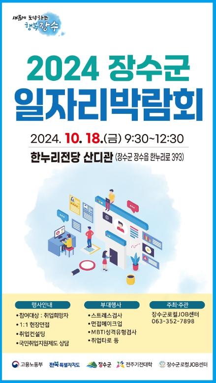 장수군 로컬JOB센터(전주기전대학 산학협력단)가 장수군 구직자들의 취업을 지원하기 위해 ‘2024 장수군 일자리 박람회’를 개최한다.