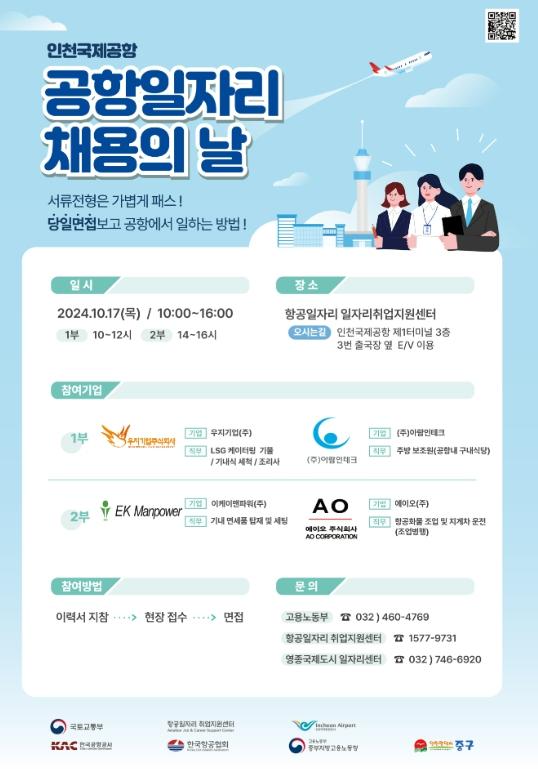 인천시 중구는 오는 17일 운서동 소재 항공일자리 취업지원센터(인천국제공항 제1여객터미널 4층)에서 ‘2024년도 제7회 공항 일자리 채용의 날’ 행사를 개최한다.
