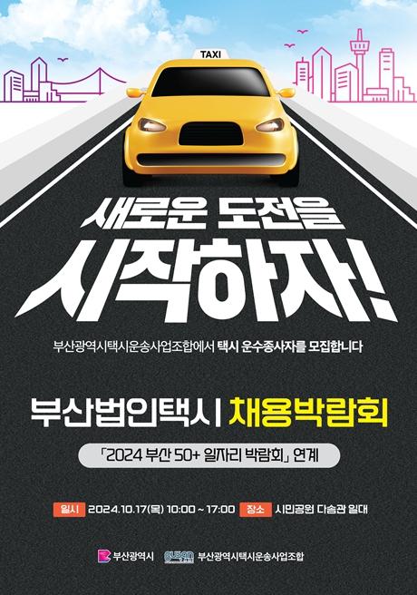 부산시는 오는 17일 오전 10시부터 오후 5시까지 부산시민공원 다솜관 일대에서 '법인택시 운수종사자 채용박람회'를 개최한다고 밝혔다.