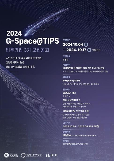 경상남도는 도내 유망 창업기업의 수도권 투자유치를 지원하는 사업인 ‘경남 창업 수도권 거점(G-Space@TIPS)’에 입주할 기업을 17일까지 모집한다고 밝혔다.