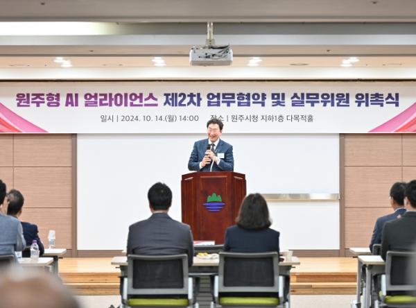 원주시는 10월 14일 오후 2시 시청 지하1층 다목적홀에서 국내 혁신 선도기업 13개 사와 협력하여, ‘원주형 AI 얼라이언스 구축 및 산업생태계 조성을 위한 업무협약(MOU)’을 체결했다.