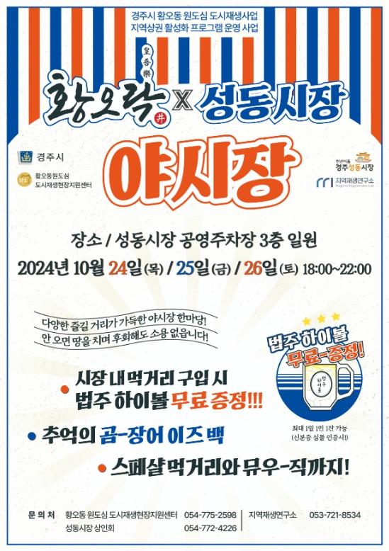 경주시와 황오동 원도심 도시재생현장지원센터에서 주최하는 이번 행사는 황오동 원도심 도시재생사업과 성동시장이 협업해 원도심의 지역 상권 활성화와 도시재생사업 지속가능성을 도모하기 위해 마련됐다.