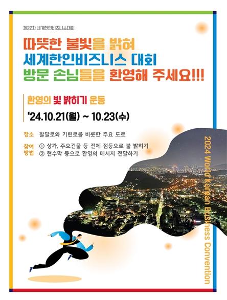전북특별자치도와 전주시, 전북특별자치도관광협회는 제22차 세계한인비즈니스대회를 맞아 오는 19일까지 전주 시내 전역에서 ‘환영의 불 밝히기’에 참여해 줄 것을 독려하는 캠페인을 전개한다.