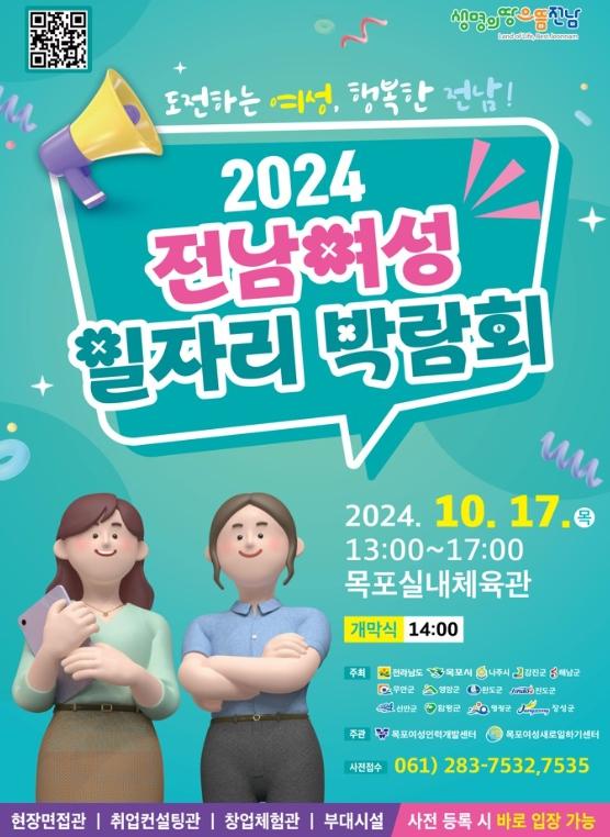 2024년 전남여성 일자리박람회가 오는 17일 오후 1시부터 5시까지 ‘도전하는 여성, 행복한 전남’을 슬로건(표어)으로 목포실내체육관에서 개최된다.