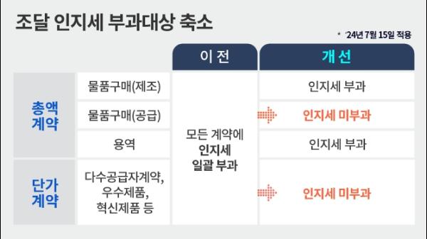 그동안 조달기업은 도급과 매매 등 계약의 성격과 무관하게 1,000만원을 초과하는 계약을 체결할 때 인지세를 납부했다. 조달청은 유관부처와의 적극적인 협의를 거쳐 상용화되어 있거나 대체 가능하여 주문제작이 필요 없는 물품 등에 대한 구매 계약에는 7월 15일부터 인지세 부과를 제외하고 있다.