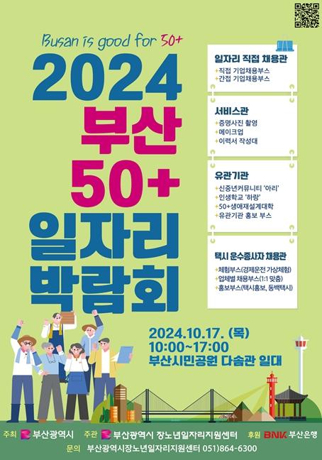 부산시는 내일(17일) 오전 10시부터 오후 5시까지 부산시민공원 다솜관 일대에서 신중년 세대의 인생 2막 도전을 지원하는 '2024년 부산 50 일자리 박람회'를 개최한다고 밝혔다.