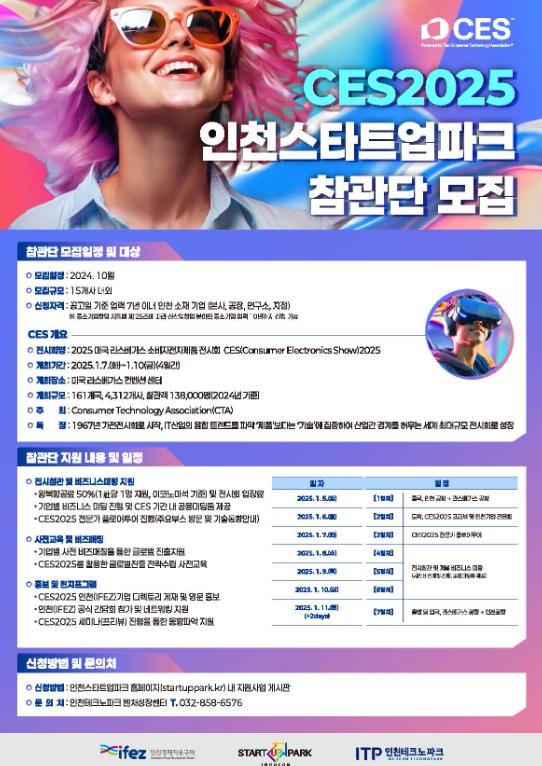 인천경제자유구역청은 내년 1월 미국 라스베이거스에서 열리는 국제전자제품박람회 2025(Consumer Electronics Show, CES 2025) 참관을 희망하는 인천 스타트업을 모집한다고 밝혔다.