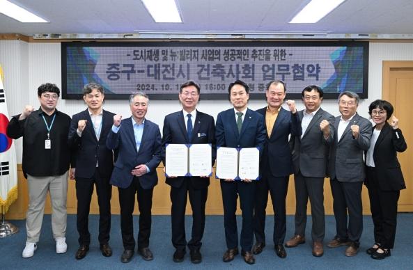대전 중구는 지난 15일 대전광역시 건축사회와 도시재생 및 뉴:빌리지 조성 사업의 성공적인 추진을 위한 업무협약(MOU)를 체결했다고 밝혔다.
