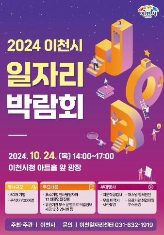 이천시는 오는 10월 24일 오후 2시부터 5시까지 이천시청 아트홀 앞 모두의 광장에서 '2024 이천시 일자리박람회'를 개최한다.