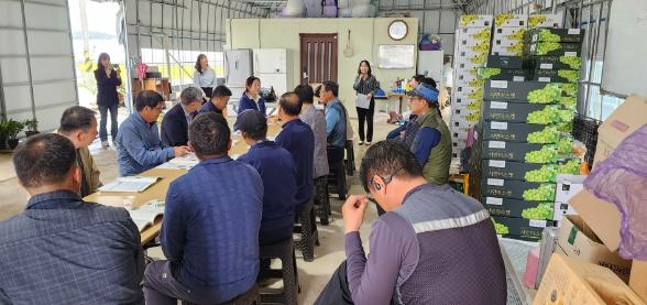 전남 함평군이 15일 꽃무릇 수출포도 영농조합법인에서 농약 안전관리 및 사후관리에 대한 기술컨설팅을 진행했다.