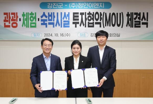 강진군이 16일 군청 소회의실에서 (주)정인이엔지와 분홍나루 일원 발전을 위해 농어촌 관광휴양시설 조성사업 투자협약을 체결했다.